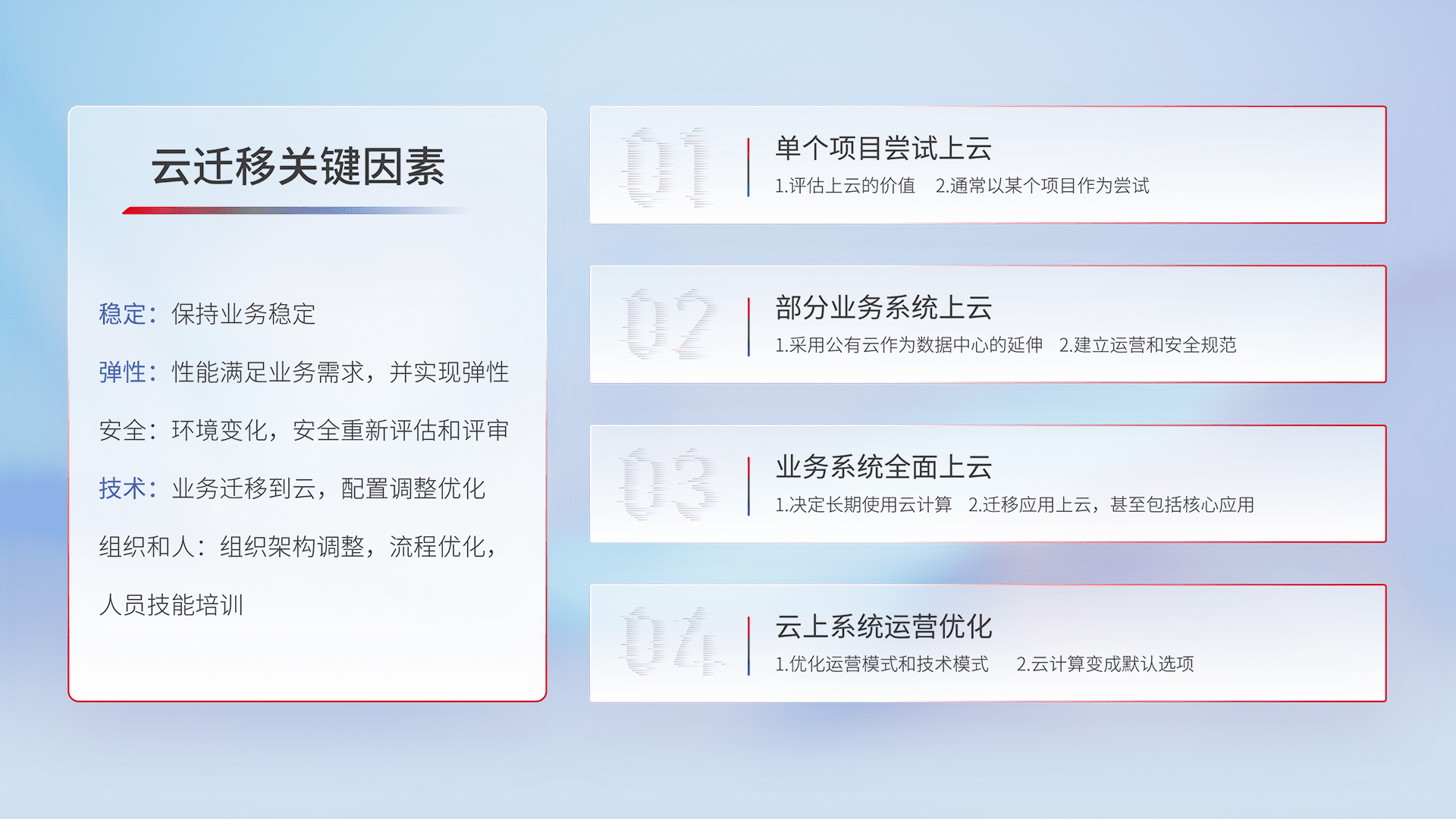 结合实际业务,,,从规划设计、、、、云平台选型、、、云原生改造、、数据迁移、、、集成交付,,迁移全过程为客户识别最佳上云路径,,,,做好风险识别管理,,,,设计网络架构、、、、身份权限、、、、安全审计合规、、、操作审计、、、日志审计、、监控告警策略、、、多站点容灾设计等,,,对云上基础设施进行整体规划,,,提升IT治理水平,,,以满足弹性、、、高可用、、、、高性能的需求。。。
