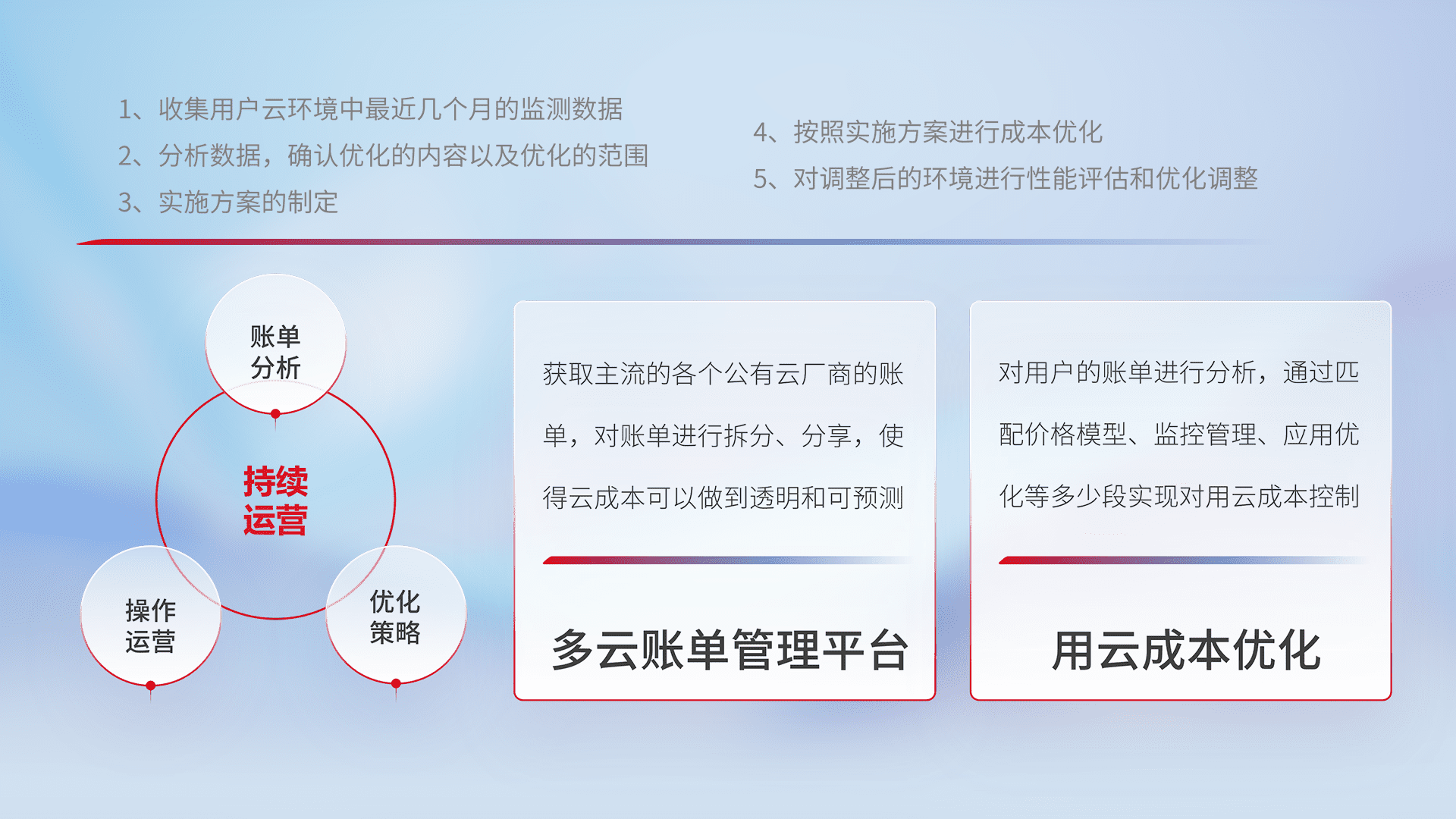 通过多云纳管,,,以统一的资源数据模型把客户的云资源进行抽象和封装,,,进而实现对多云资源的统一操作,,保障云资源管理的可靠性、、、稳定性与可用性。。。量身定制化运维内容,,,配置、、、开发运维、、补丁管理、、、备份、、、监控、、、认证和访问管理、、、审计和日常巡检等,,,保障在用云过程中的可靠度,,,稳定度以及高可用率。。